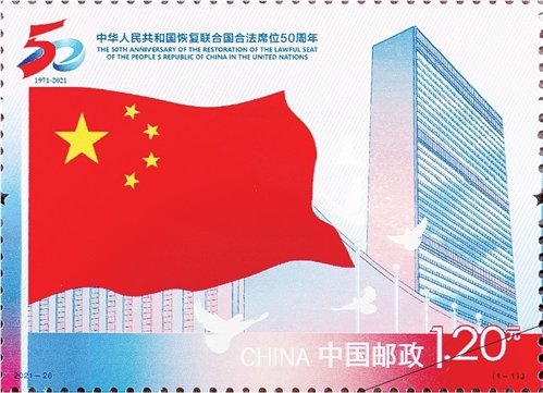 10月25日,中國郵政發(fā)行《中華人民共和國恢復(fù)聯(lián)合國合法席位50周年》紀(jì)念郵票一套1枚,全套郵票面值1.20元。郵票計劃發(fā)行數(shù)量為700萬套。