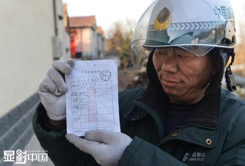 在他的這條郵路上,有5個郵政排單的蓋章點,他每天都會認(rèn)認(rèn)真真的蓋完。圖為董乃軍在張家洞村展示已經(jīng)蓋完印章的排單。