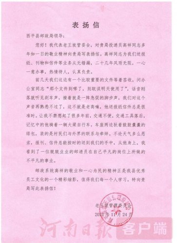這位被表?yè)P(yáng)的投遞員名叫高祥,是西平縣郵政分公司攬投部的一名投遞員,在投遞崗位上勤勤懇懇的工作了31年,也是資歷最老的投遞員了。他每日從攬投部要跑40多分鐘才能到達(dá)投遞段道,服務(wù)區(qū)域主要集中在老王坡農(nóng)場(chǎng)等,投遞里程超57公里。