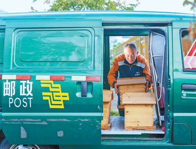 在浙江省湖州市長(zhǎng)興縣,林城鎮(zhèn)郵政所蜂產(chǎn)業(yè)專職投遞員王國(guó)慶把要寄遞的蜂箱搬上快遞車。 許斌華攝(影像中國(guó))