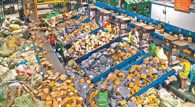 中國(guó)郵政集團(tuán)有限公司湖南省衡陽郵區(qū)中心,工作人員在分揀快遞包裹。 曹正平攝(人民視覺)