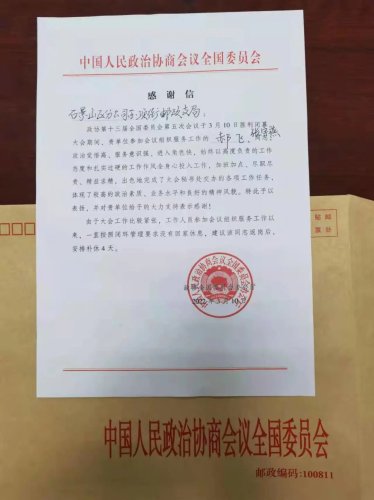3月10日,中國人民政治協(xié)商會議全國委員會辦公廳向石景山區(qū)分公司寄來感謝信,對郵政兩會服務(wù)工作給予充分肯定和衷心感謝。信中表示,石景山區(qū)分公司郝飛、張宇燕同志在大會期間加班加點(diǎn),恪盡職守、熱情服務(wù),出色地完成大會秘書處交辦的各項(xiàng)工作任務(wù)。
