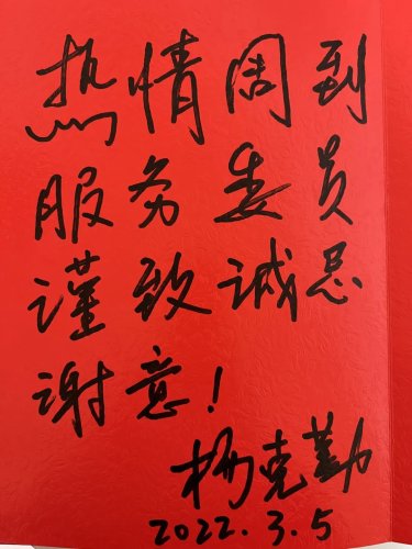 全國政協(xié)委員楊克勤寫下:熱情周到服務(wù)委員,謹(jǐn)致誠懇謝意!