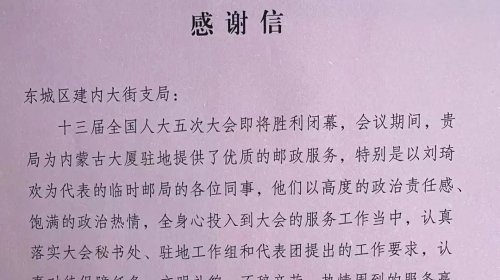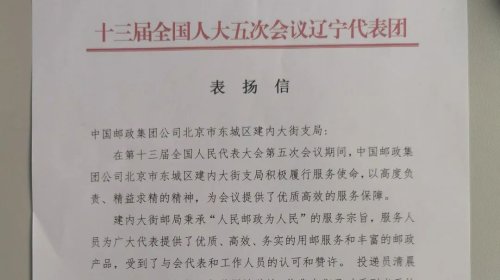 遼寧代表團(tuán)在感謝信中提到,“建內(nèi)大街支局秉承‘人民郵政為人民’的服務(wù)宗旨,為廣大代表提供了優(yōu)質(zhì)、高效、務(wù)實(shí)的用郵服務(wù)和豐富的郵政產(chǎn)品,受到了與會代表和工作人員的認(rèn)可和贊許,投遞員清晨就將當(dāng)天的會議用報(bào)及郵件送到駐地,保證了時(shí)限。在此向中國郵政致以誠摯的感謝,并提出表揚(yáng)!”