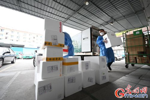 郵政快遞作為民生重點(diǎn),也在積極參與抗疫保供。4 月 24 日一早,上海市支援物資、市區(qū)醫(yī)院的藥品先后抵達(dá)奉賢區(qū)中轉(zhuǎn)站,郵政工作人員立即進(jìn)行消殺、并第一時(shí)間進(jìn)行配送。(沈春琛攝 / 光明圖片 / 視覺中國(guó))