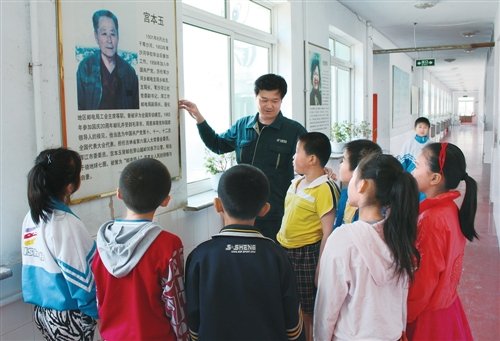 王明杰向葦沙河鎮(zhèn)小學(xué)的同學(xué)講述郵政“鐵人”宮本玉的事跡。□王家柱 攝