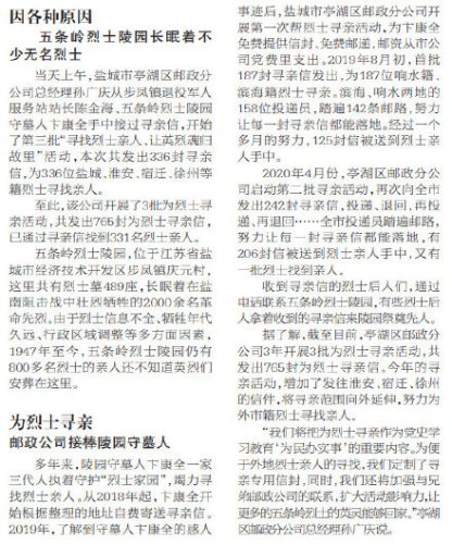 “爺爺,70多年了,我們終于找到您了!”4月3日,江蘇省鹽城市阜寧溝墩三合村陳必虎烈士的侄孫女陳女士來到五條嶺烈士陵園內(nèi)祭掃,她拿著收到的尋親信痛哭不已,她說終于圓了一家?guī)状恕?4年的尋親夢。五條嶺烈士陵園長眠著不少無名烈士,3批為烈士尋親活動(dòng)共發(fā)出765封為烈士尋親信,已通過尋親信找到331名烈士親人。