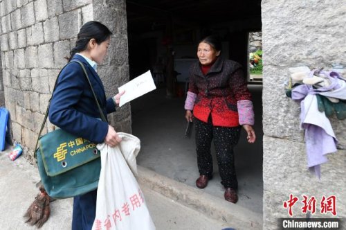 圖為蔣玉美走村入戶送郵件?!⊥鯑|明 攝