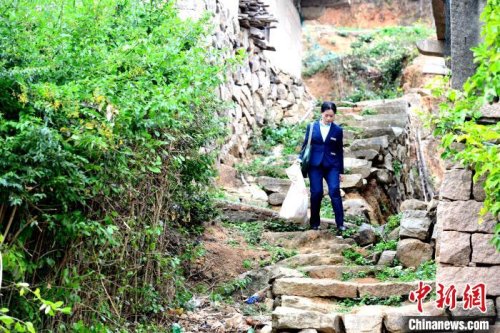 15日15時(shí),中新網(wǎng)記者跟隨蔣玉美走村入戶,投遞郵件、報(bào)刊和各類包裹。一路上,或是陡坡,或是山間小路,崎嶇不已。