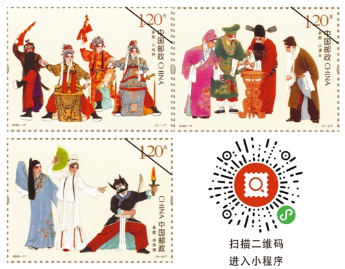 該套郵票全套3枚,郵票圖案名稱分別為“火焰駒”“三滴血”“游西湖”。郵票選取了《火焰駒》《三滴血》《游西湖》3部秦腔經(jīng)典傳統(tǒng)劇目的精彩片段,分別表現(xiàn)了銅錘花臉、文武小生、丑角、老生、小生、小旦等典型戲曲人物形象,原畫為絹本設(shè)色,采用中國傳統(tǒng)工筆畫法,運用粗獷的線條、濃烈的色彩,以呼應(yīng)秦腔獨特的藝術(shù)風(fēng)格,同時結(jié)合淡雅的背景,烘托前景重彩戲曲人物,增添了畫面的古風(fēng)雅韻。