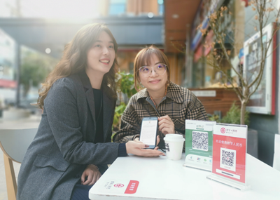 客戶(左)在郵儲(chǔ)銀行深圳分行數(shù)字人民幣試點(diǎn)商戶(右)的指導(dǎo)下體驗(yàn)數(shù)字人民幣消費(fèi)。