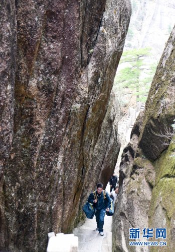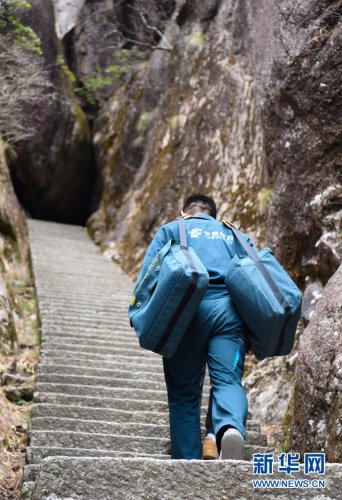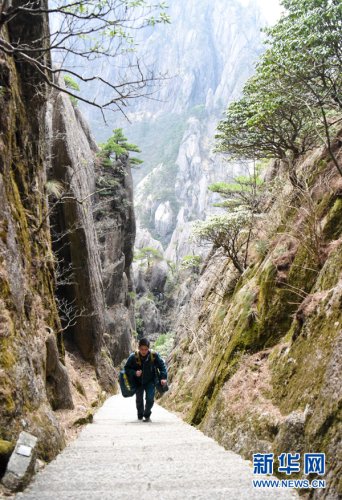 黃山素有“三十六大峰,三十六小峰”之稱,主峰蓮花峰海拔高達(dá)1864.8米。風(fēng)景區(qū)內(nèi),山路崎嶇、不通車馬,山上工作人員和游客所需的報刊、信件等,只能靠謝菲俊背著郵包送上山。