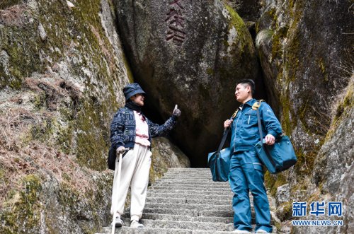 3月16日,黃山風(fēng)景區(qū)內(nèi),謝菲俊背著郵包仰望山頂。
