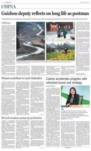 3月31日,《中國(guó)日?qǐng)?bào)》旗艦版、香港版7版頭條刊發(fā)《Guizhou deputy reflects on long life as postman (全國(guó)人大代表莫富元的二十八載郵遞路)》。