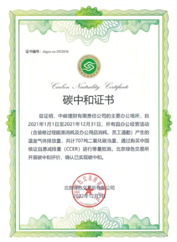在以“眾生的地球”為主題的第54個世界地球日到來之際,北京綠色交易所為首批開業(yè)的銀行理財子公司“中郵理財”出具組織運營層面“碳中和”證書。由此,中郵理財成為國內(nèi)領先的獲得權(quán)威機構(gòu)認證的“碳中和理財公司”,為世界地球日增添一抹新的綠色。