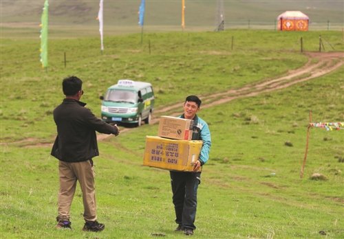 看到郵車來了,牧民迫不及待地迎上去接過自己網(wǎng)購的商品。□《工人日報》記者 王偉偉 攝