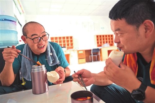 許桂明和同事插空吃簡(jiǎn)單的午飯。