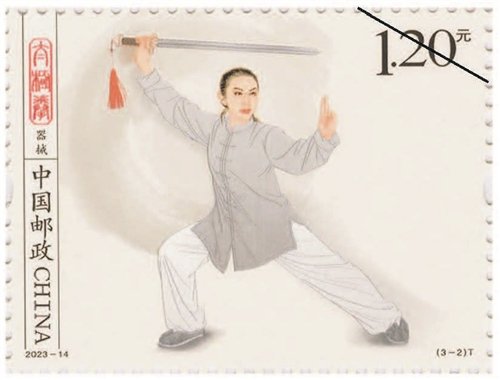 該套郵票一套3枚,圖案內(nèi)容分別為拳術(shù)、器械、推手。郵票采用工筆人物形式表現(xiàn),整體色調(diào)以黑白灰為主,背景采用水墨飛白映襯太極拳平和、包容、大道至簡的意境。第一枚郵票表現(xiàn)了一位白發(fā)長須老者,正氣定神閑地做著太極拳單鞭動作,體現(xiàn)出太極拳的傳統(tǒng)風(fēng)范和延年益壽的作用。背景用揮灑自如的水墨筆觸和肌理來表現(xiàn),伴隨老者動作產(chǎn)生無形氣韻。第二枚郵票中是一位英姿颯爽的舞劍女子,背景中如影隨形的氣流若隱若現(xiàn),體現(xiàn)出太極劍行云流水的特點(diǎn)。第三枚郵票中是一對進(jìn)行太極拳推手的男女青年,一男一女、一黑一白象征太極的陰陽相濟(jì),背后的水墨肌理隱約形成陰陽的概念,刻畫出“陰陽太極本相隨、動靜虛實(shí)把手推”的場景。