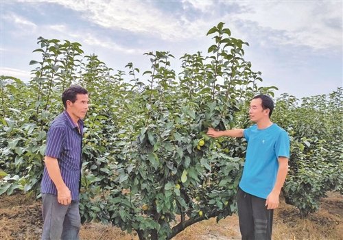 丁丹偉(右)在了解果樹長勢時與農(nóng)戶交談。