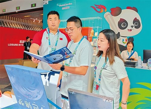 郵政工作人員向運(yùn)動(dòng)員細(xì)致介紹大運(yùn)會(huì)文化產(chǎn)品。
