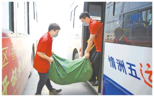 工作人員將分揀完的快遞包裹搬上公交車,送往鎮(zhèn)級快遞網(wǎng)點。(□資料圖)