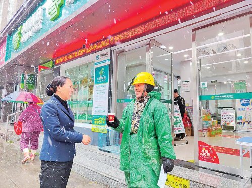 1月22日,我國(guó)南方大范圍降雪。江西省鷹潭市余江區(qū)郵政分公司金融網(wǎng)點(diǎn)的工作人員一早就支起“茶攤”,為戶外勞動(dòng)者和來(lái)往群眾送上熱氣騰騰的姜茶。