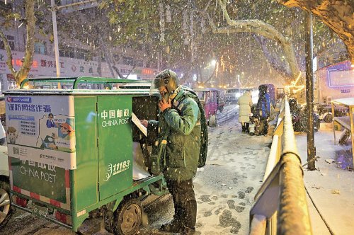 1月31日晚,周口地區(qū)大雪紛飛,道路結(jié)冰、路面濕滑,給交通造成了影響,也給郵政投遞工作帶來了挑戰(zhàn)。周口市郵政分公司早部署、細謀劃,認真落實雨雪天氣應急預案,在確保員工和車輛安全的情況下,全力保障郵件準時送達。各網(wǎng)點投遞員牢記職責,堅守崗位,迎著風雪穿梭在大街小巷,確?!暗郊嘏桑杉剡_”。