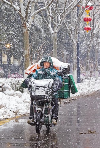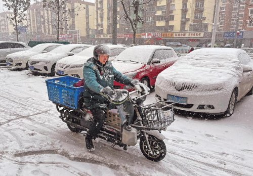 2月4日,江蘇省淮安市迎來強(qiáng)降雪。淮安郵政分公司投遞人員堅(jiān)守崗位,在大雪中小心騎行,將一份份報(bào)紙、一件件包裹準(zhǔn)時(shí)送到客戶手中?! 蹶惡啤z影報(bào)道