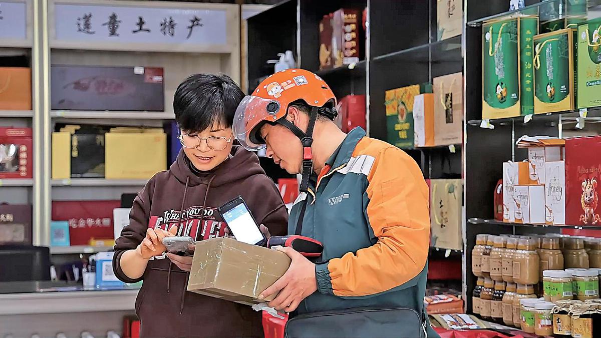 郵政攬投員上門為茶商提供收寄服務(wù)。