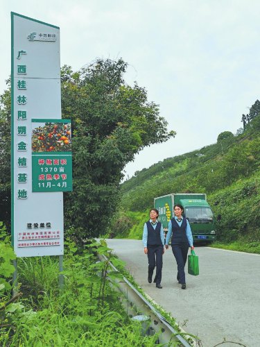陽朔縣郵政分公司員工來到白沙鎮(zhèn)古板水果專業(yè)合作社,上門了解金桔生長情況?! 踔袊]政報記者 呂文禮 攝