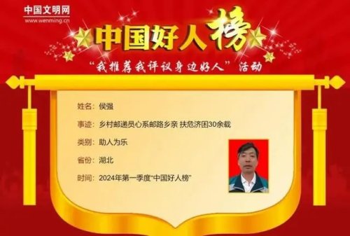其中,鄖陽區(qū)郵政局南化塘支局投遞員侯強當(dāng)選“助人為樂”類中國好人,一起來了解他的先進(jìn)事跡。