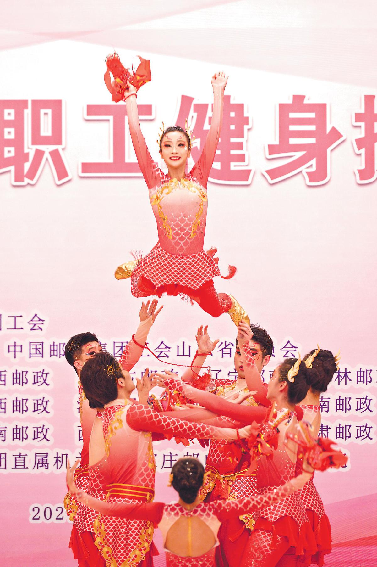 黑龍江郵政代表隊(duì)隊(duì)員的表演以“龍”為主要元素,開場時的高難度動作贏得了全場的喝彩。