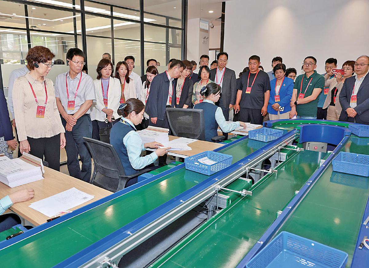 5月13日上午,來自北京、天津、河北、江蘇、山東5個(gè)?。ㄊ校┑牟糠秩珖舜蟠韥淼健敖K法郵集約化服務(wù)中心”,先后視察法院集中送達(dá)中心、集中編目中心、12368訴訟服務(wù)熱線中心等工作區(qū)域,詳細(xì)了解了運(yùn)營模式、服務(wù)流程、創(chuàng)新成效等。