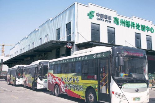 交郵合作公交車在亳州郵件處理中心等待裝運郵件。