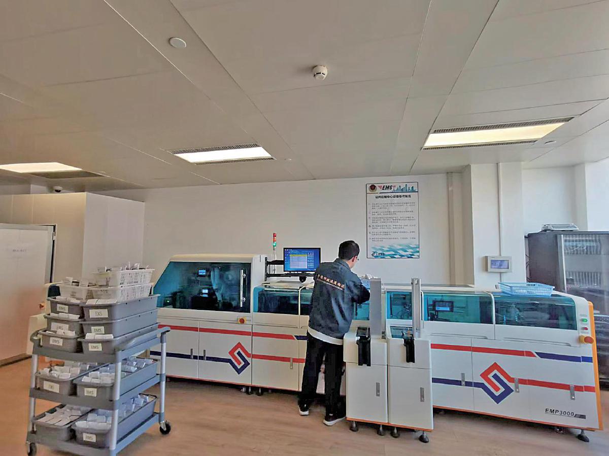 上海郵政工作人員駐點(diǎn)張江出入境制證中心,操作郵件封裝機(jī)。