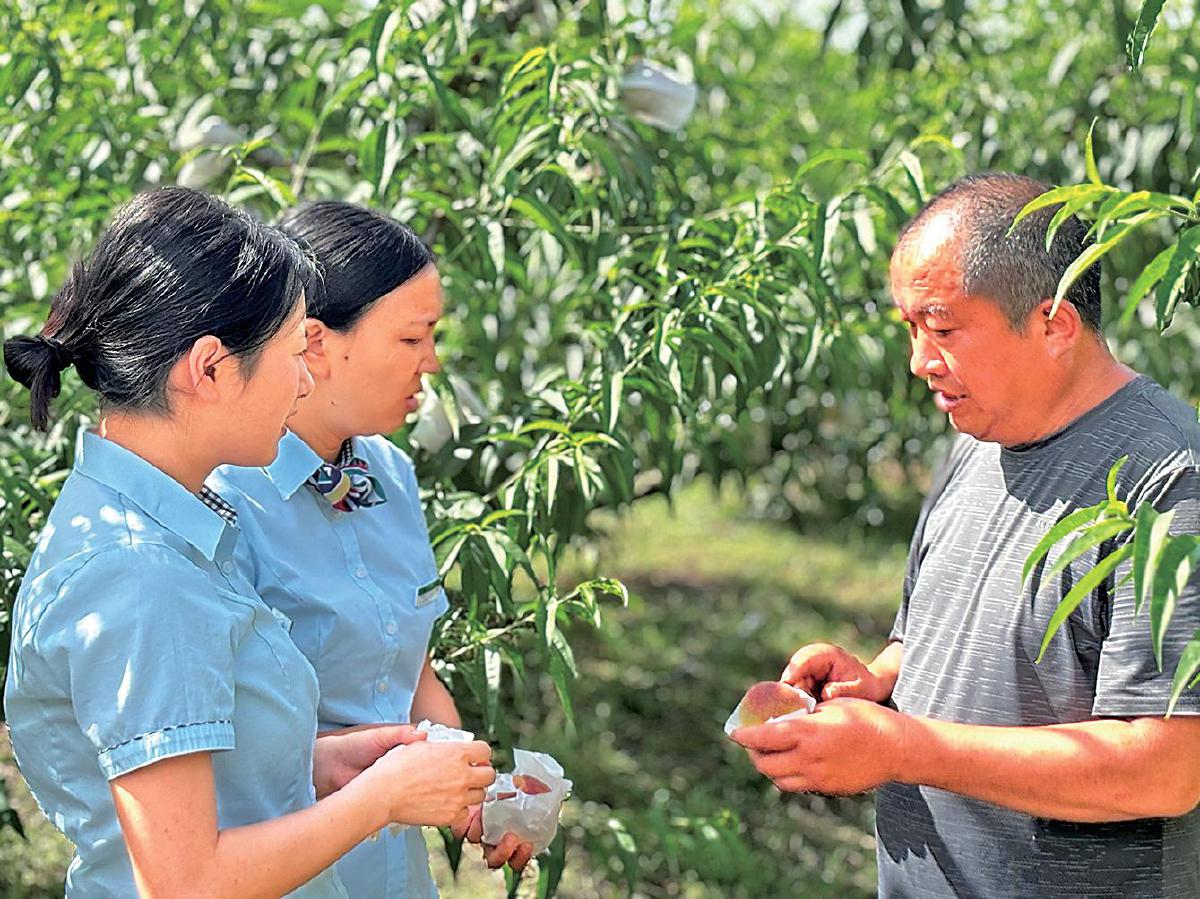 郵政工作人員在郭家村果園了解農(nóng)品情況,并向農(nóng)戶介紹郵樂平臺(tái)?! 跛呜懛f 攝