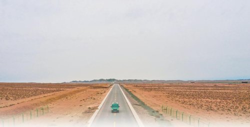在從明水村返程的郵路上,在馬鬃山的落日與晚霞中,路邊一株株芨芨草、駱駝刺格外挺拔,迎風(fēng)抖動。一輛在風(fēng)沙中疾馳的綠色郵車,配上駕駛室里橙衣綠褲、英姿颯爽的“牡丹花”,成就了瀚漠中的最美風(fēng)景。