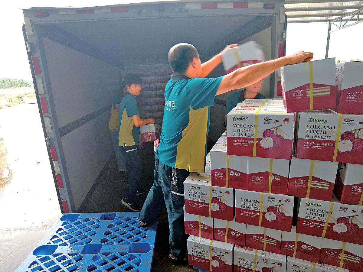 郵政工作人員正在將荔枝郵件搬運(yùn)裝車?!踔袊?guó)郵政報(bào)記者 黃文燕 攝