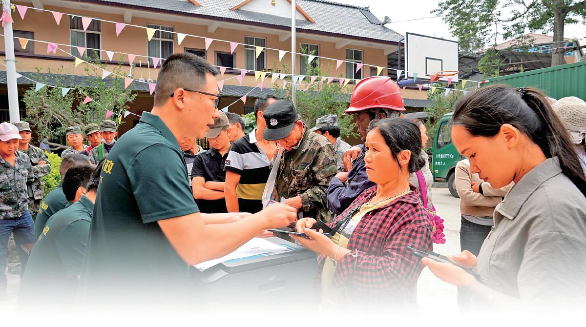 5月16日,在云南省普洱市瀾滄縣阿里村郵政臨時(shí)服務(wù)點(diǎn),郵政員工為村民現(xiàn)場(chǎng)辦理摩托車滅失注銷登記、保險(xiǎn)繳納等業(yè)務(wù),受到群眾的熱烈歡迎?!踔袊?guó)郵政報(bào)記者 張晉通 攝