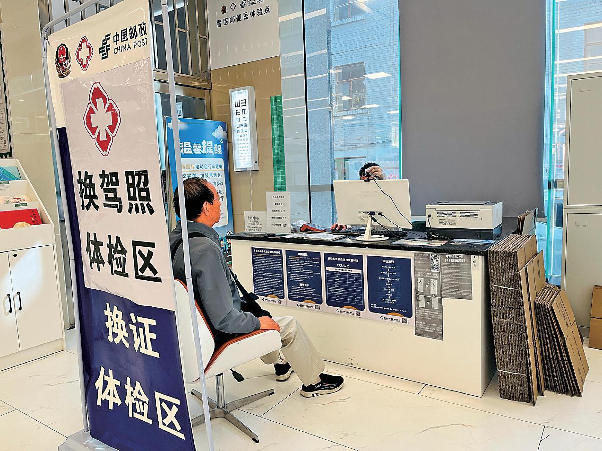在昆明市吳井路郵政支局,工作人員為辦理機(jī)動(dòng)車駕駛證換證業(yè)務(wù)的客戶進(jìn)行體檢。