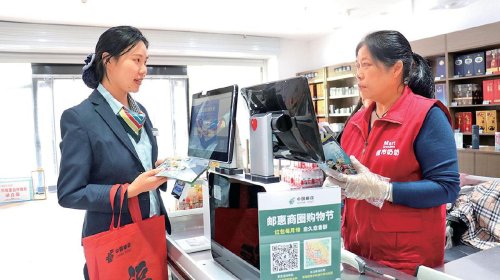 淮安郵政網(wǎng)點人員向煙酒超市收銀員推薦郵惠商圈活動。