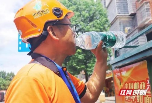 三伏天郵政人喝大量水解渴消暑。
