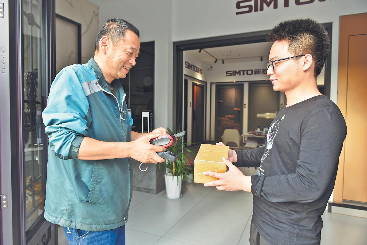 江蘇省南通市海門區(qū)郵政分公司員工上門為客戶提供退換貨寄遞服務(wù)?! 跬鯕g 攝