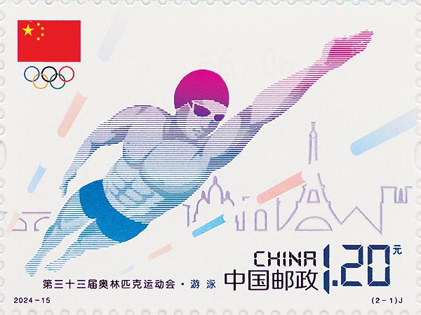 第三十三屆奧林匹克運動會將于法國巴黎當(dāng)?shù)貢r間2024年7月26日開幕,8月11日閉幕。這是整整一個世紀(jì)后,奧運會重回巴黎,法國首都將成為繼倫敦之后第二座三次舉辦夏奧會的城市。該套郵票共2枚,郵票圖案名稱為《游泳》《攀巖》。郵票采用簡約、概括的圖形化設(shè)計方式,展現(xiàn)兩項運動的精彩瞬間。郵票第1枚《游泳》(見下圖)表現(xiàn)了男子自由泳的形象,畫面采用從水中仰視的角度,展現(xiàn)運動員劈波斬浪、奮力向前的姿態(tài)。郵票第2枚《攀巖》表現(xiàn)了女子速度攀巖的形象,畫面采用斜側(cè)視角,展現(xiàn)運動員抬腿踩點、向上攀拉的動作。兩枚郵票的畫面背景為埃菲爾鐵塔等巴黎城市建筑,體現(xiàn)了本屆奧運會的地域特色。該套郵票結(jié)合高精度膠版印刷工藝,整體畫面色彩明亮、充滿活力,邊飾漸變過渡自然,同時輔以局部燙印工藝,點亮主題背景,增強畫面動感。