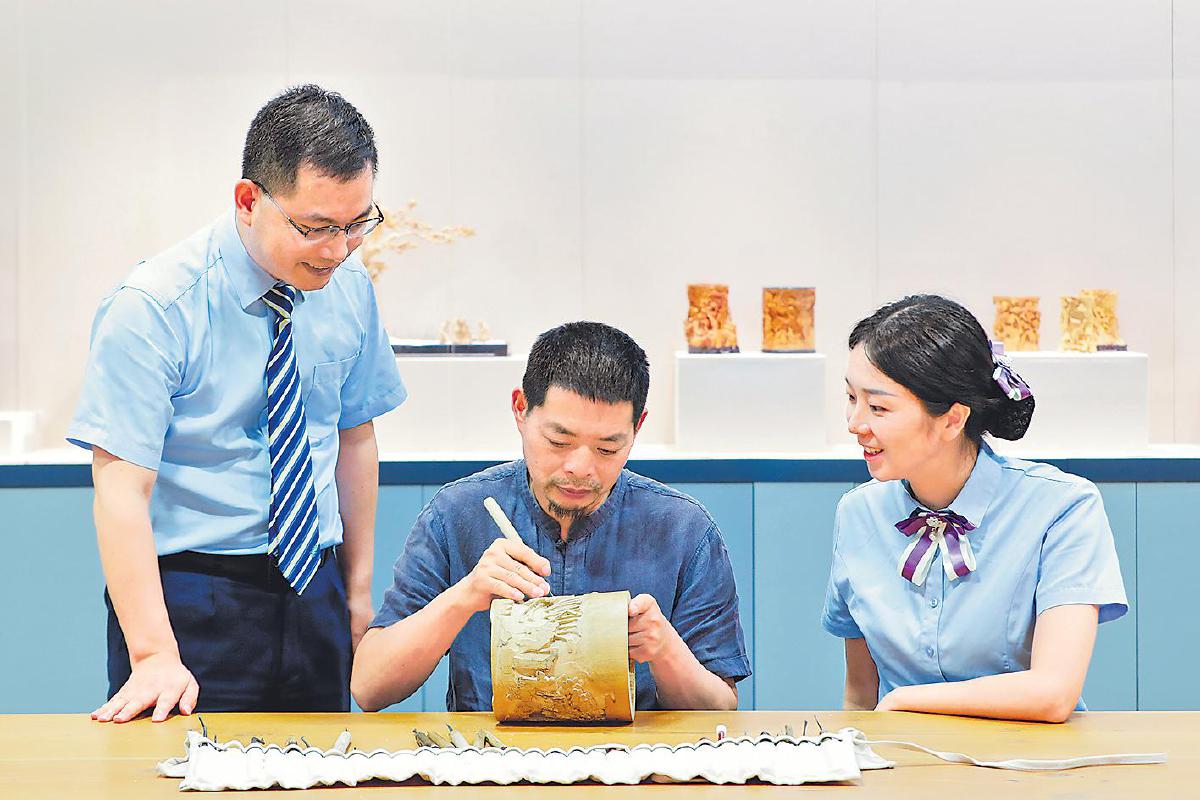 非遺傳人洪建華展示雕刻技藝?! 跏﹣喞凇z