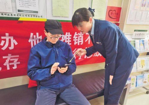 李倩教客戶使用手機辦理業(yè)務(wù)。