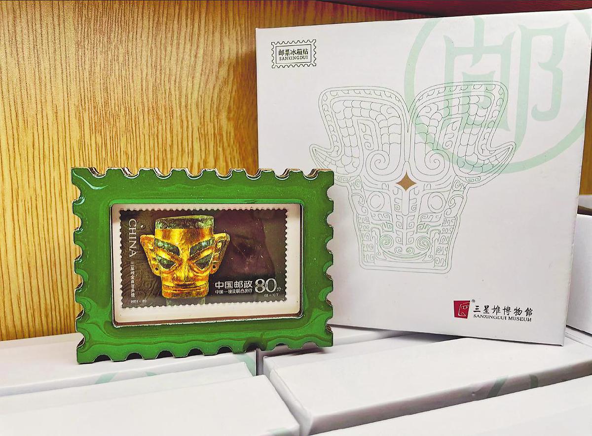 郵局內(nèi)部共設(shè)有三個區(qū)域,分別為客戶體驗區(qū)、產(chǎn)品銷售區(qū)和服務(wù)收銀區(qū)。產(chǎn)品銷售區(qū)內(nèi),各式充滿三星堆元素的郵品及文創(chuàng)產(chǎn)品琳瑯滿目,陳列規(guī)范、擺放整齊,所有產(chǎn)品的設(shè)計靈感均來源于神秘浪漫的古蜀文明。其中,最受廣大游客喜愛的產(chǎn)品就是兼具三星堆與郵政特色的郵票冰箱貼和極限明信片,二者皆是饋贈親朋好友的首選佳品。