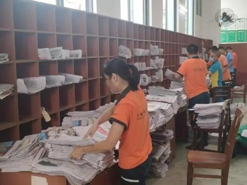 在澄邁縣郵政分公司郵件處理中心,分揀和投遞人員加班加點(diǎn),集體投入臺風(fēng)期間停運(yùn)的報(bào)紙分發(fā)和投遞工作中,確保第一時(shí)間將報(bào)紙投遞上門,展現(xiàn)郵政速度。