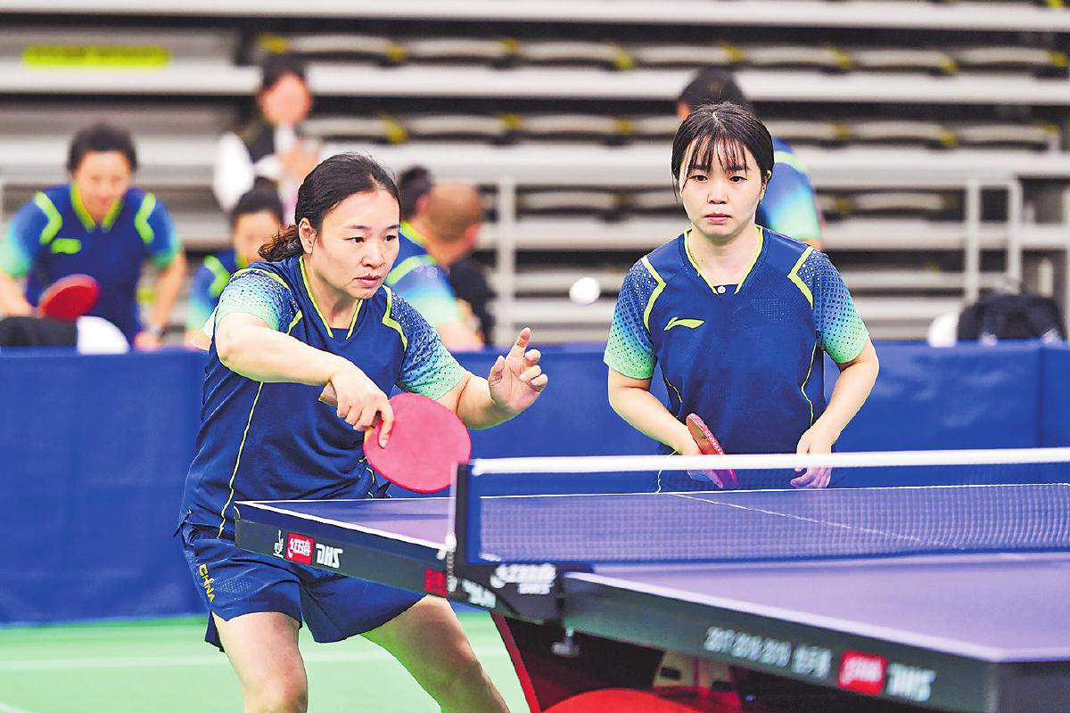 比賽中,男雙組合選手嚴(yán)陣以待。