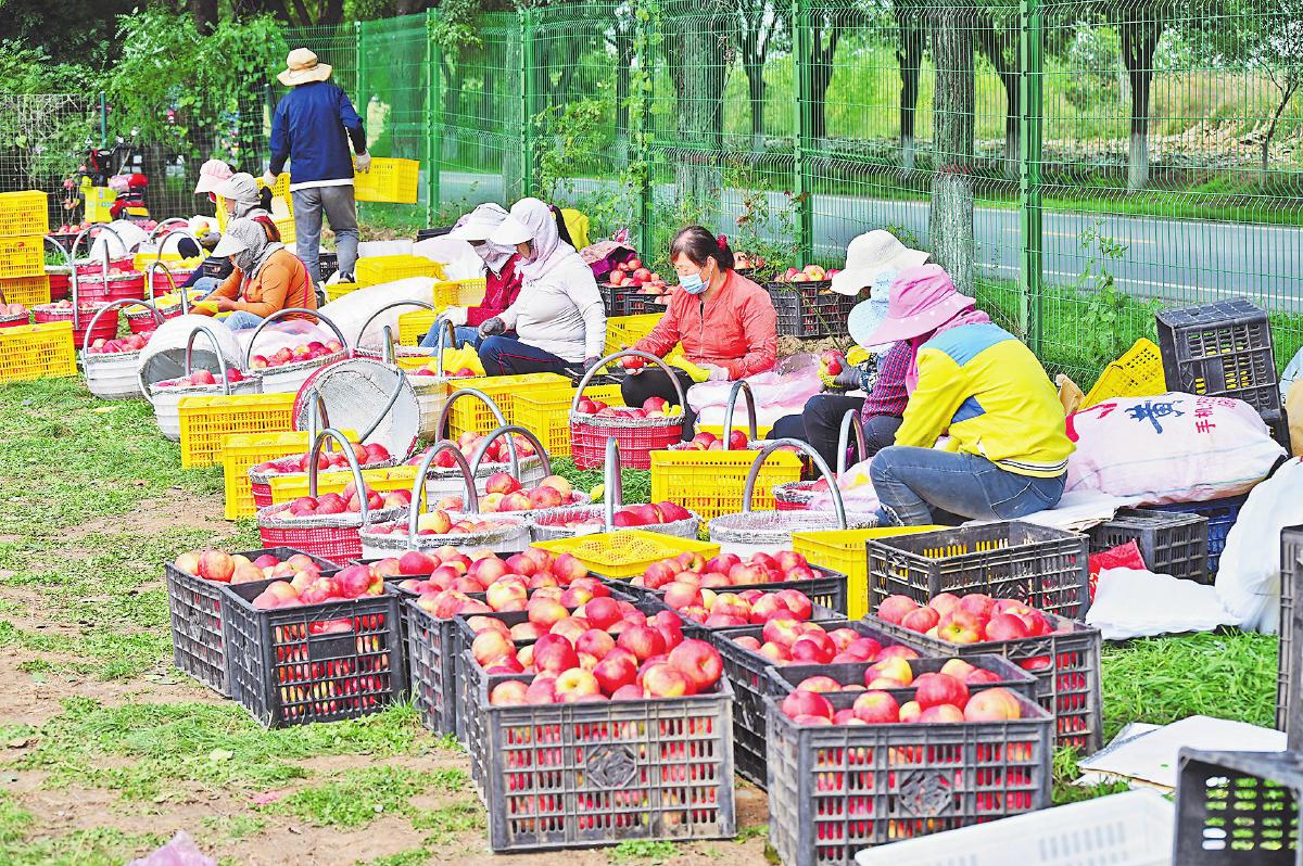 果農(nóng)在蘋果種植基地選果,準備通過郵政發(fā)運?!跬跣銟s 攝